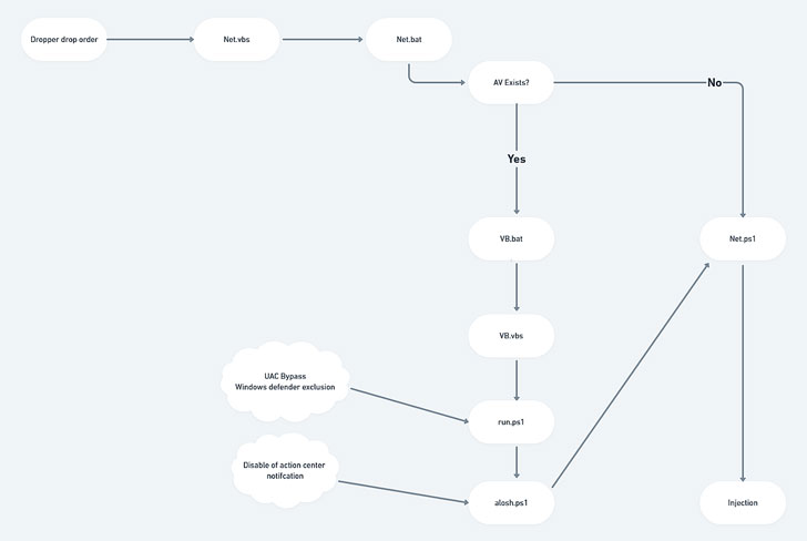 Esto da como resultado la ejecución de un módulo .NET en memoria que posteriormente actúa como cuentagotas para tres archivos, uno que actúa como disparador para el siguiente, para finalmente entregar AsyncRAT como la carga útil final, al mismo tiempo que verifica el software antivirus y configura Exclusiones de Windows Defender.